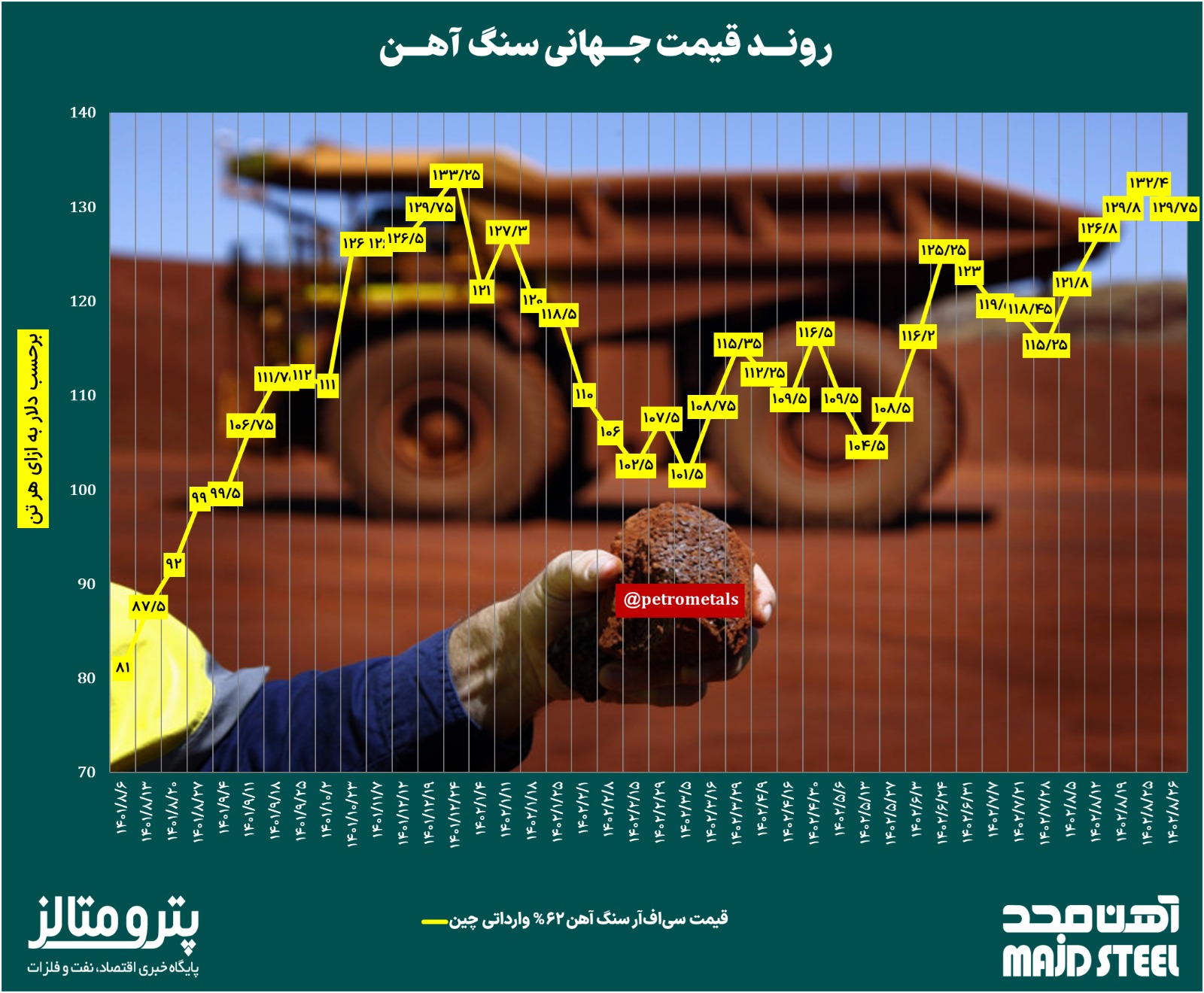 به گزارش پترومتالز، قیمت سنگ آهن عیار ۶۲ درصد وارداتی چین در هفته گذشته در مجموع تغییر چندانی نسبت به هفته منتهی به ۱۹ آبان نداشت و در روز جمعه ۲۶ آبان قیمت سنگ آهن به ۱۲۹.۷۵ دلار به ازای هر تن رسید. با این وجود، قیمت سنگ آهن در هفته گذشته تا کانال ۱۳۲ دلاری نیز بالا رفت و سپس مقداری عقبنشینی کرد.