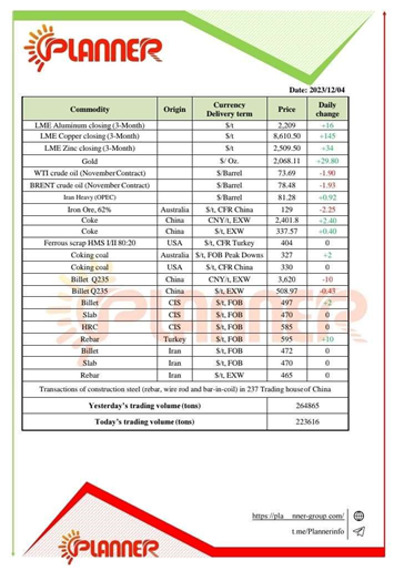 جدول قیمت زنجیره فولاد؛ انرزی و فلزات اساسی در تاریخ 4 دسامبر 2023 طبق اعلام مؤسسه پلنر